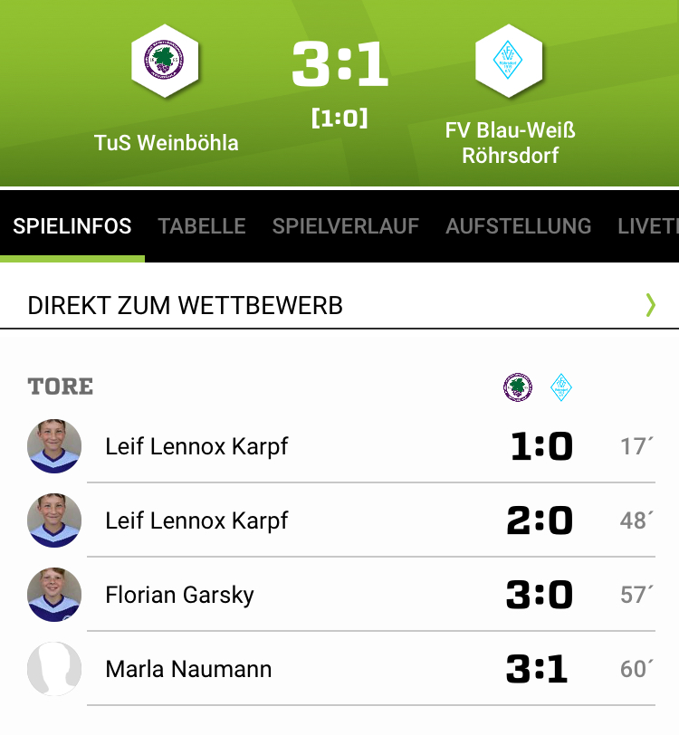 Mit dieser Führung ging es dann in den finalen Spielabschnitt. Dem anwesenden Weinböhlaer Anhang war klar, dass diese Partie noch lange nicht entschieden war. Röhrsdorf, stets fair spielend, erhöhte noch einmal den Druck und unser Keeper Kurt musste mehrfach in höchster Not retten. Jetzt gelang es unserer Vertretung jedoch besser, mit schnellen Gegenangriffen, für Entlastung zu sorgen. In der 57. Spielminute lief der Ball über die linke Seite der Gastgeber. Die Verteidiger konnten unseren Spieler Florian G. nicht am Eindringen in den Strafraum hindern und dieser versenkte die Kugel – zur Überraschung aller - in der kurzen Torwartecke. Zwar gelang den Gästen in der 60. Minute mit einem Traumfreistoß von Maria aus 20 Meter in das lange Weinböhlaer Toreck noch der Anschlusstreffer - mehr aber auch nicht. Abpfiff! Jubel! Drei Punkte für unsere TuS!